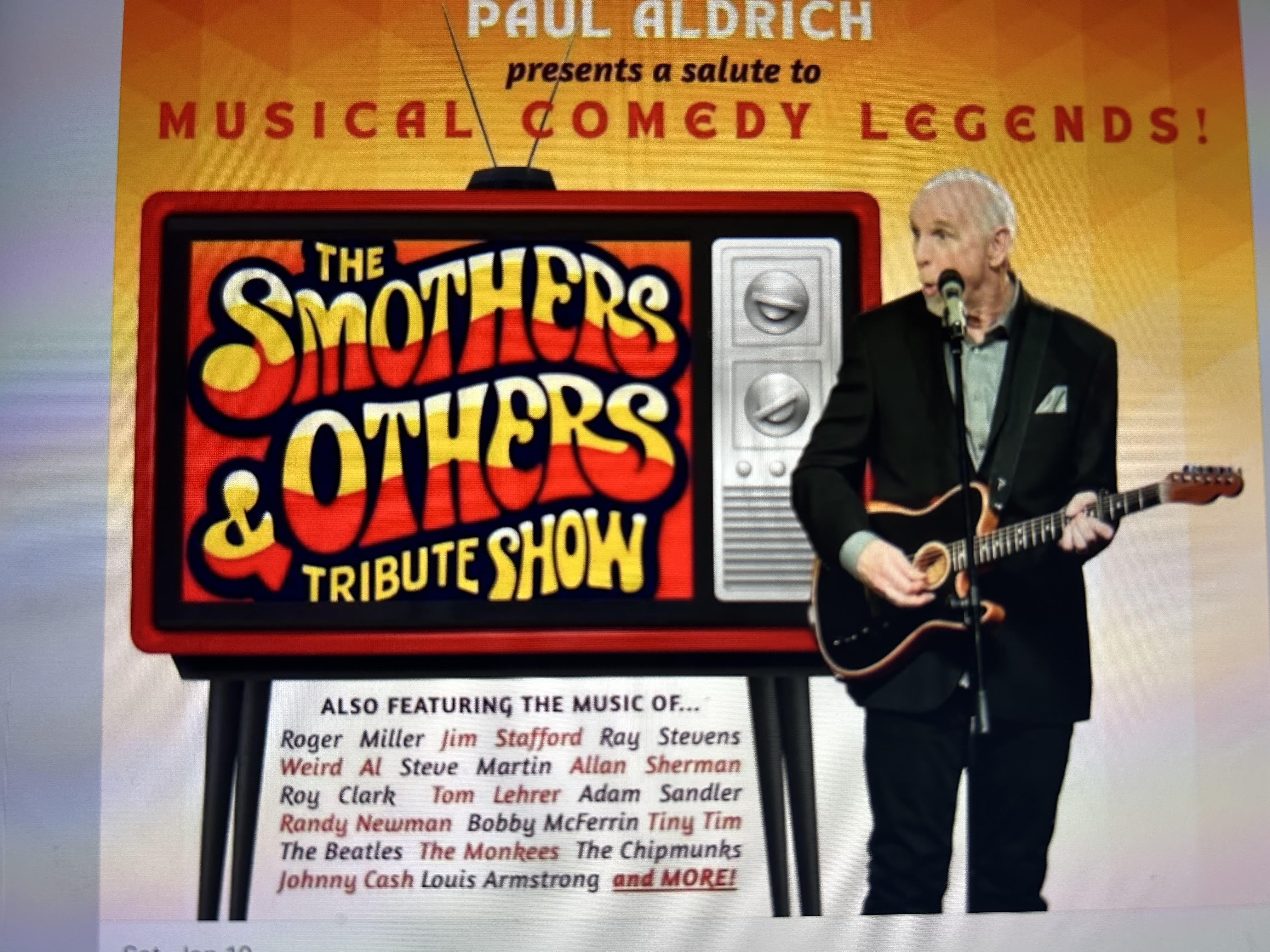 “Smothers & Others” is a wildly entertaining one-man musical comedy tribute starring comedian, musician, and master impressionist Paul Aldrich. Packed with laugh-out-loud moments from start to finish, the show takes audiences on a joyful journey through the rich history of musical comedy — blending clever parodies, spot-on impressions, and toe-tapping songs that will have you smiling, singing along, and wondering what he’ll do next.